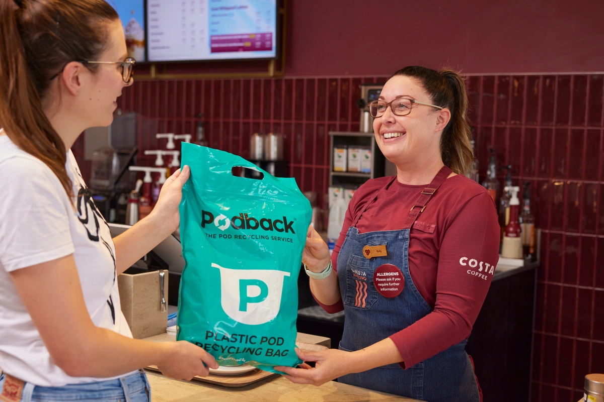 Podback recycling points have been set up in selected Costa Coffee stores in Tesco supermarkets. At these stores, you will be able to pick up a Podback recycling bag from your barista, and drop your filled bag back for recycling when it’s full.